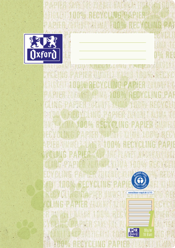 Schreiblernlinien mit farblicher Umrandung, 90 g/qm, seidenglattes Recycling Papier ohne Durchscheinen von Tinte, robuster Umschlag, mit Beschriftungsfeld und Löschblatt,, Rückendraht geheftet, Farbe: grün, (400159463)