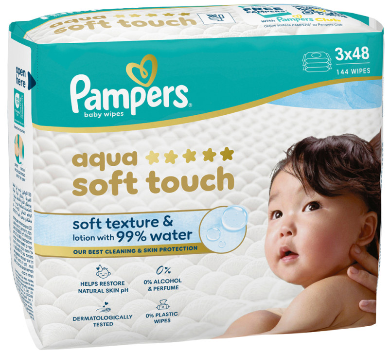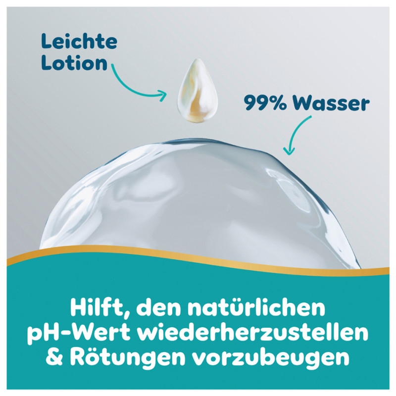 lotion composée de 99% d'eau, structure alvéolée douce,, la formule aide à rétablir le pH naturel de la peau,, sans alcool ni parfum, contenu: 3x 48 pièces, (8006530142113)