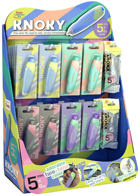 en présentoir de comptoir, au format stylo, forme ergonomi-, que, design bicolore, assorti dans 4 couleurs, dimensions du, présentoir: (L)330 x (P)190 x (H)390 mm, contenu: 48 rubans correcteurs rétractables + 12 recharges, (XZTT805-5E)