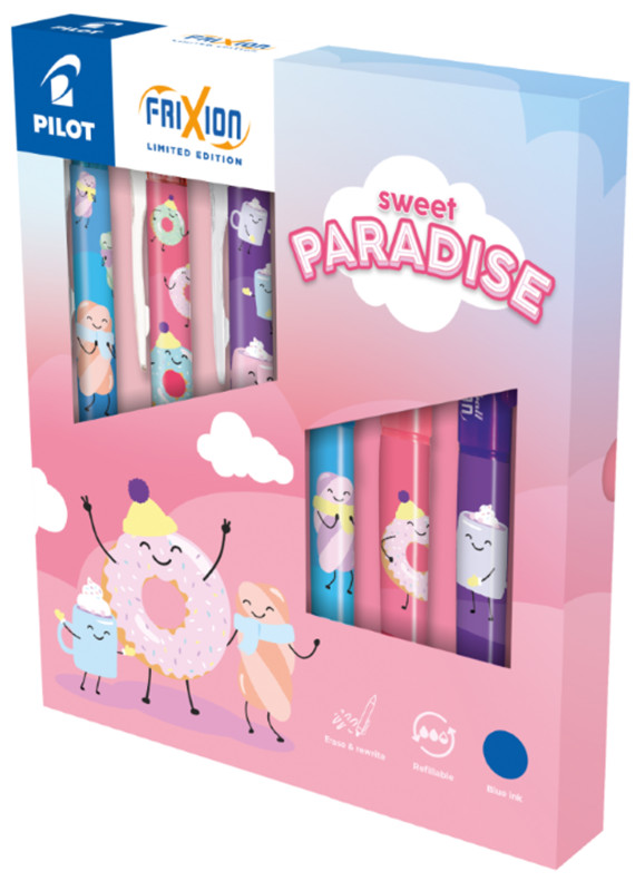 édition spéciale Sweet Paradise, couleur du tracé: bleu,, largeur de tracé: 0,35 mm, encre brevetée, effaçable, contenu: 3x stylo roller FRIXION BALL 07 Fancy Winter, 3x stylo roller FRIXION BALL CLICKER 07 Fancy Winter, (WLT458838)