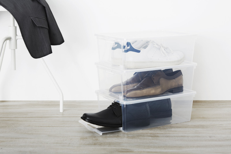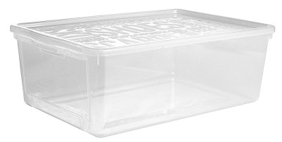 dimensions: (L)257 x (P)385 x (H)133 mm, couleur:transparent, matériau: PPR, empilable, équipée d'un couvercle à clic,, couvercle avec l'inscription "Shoes" imprimée en différentes, langues dans une écriture graphique, (19880800)