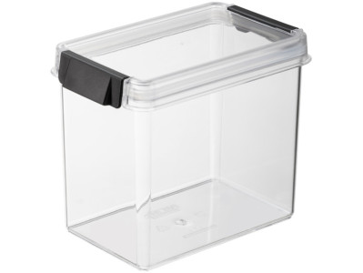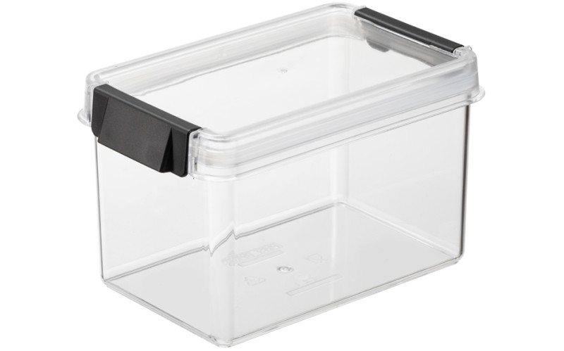rectangulaire, transparent/noir, en SAN/silicone, à usage, alimentaire, couvercle hermétique à clip, couvercle & fond, transparents, clip noir, empilable,, dimensions: (L)168 x (P)109 x (H)215 mm, (18040801)