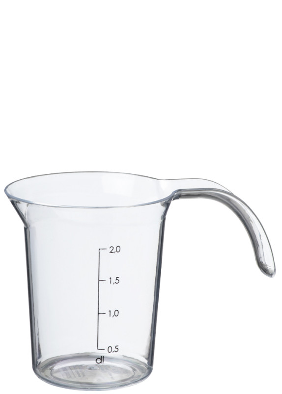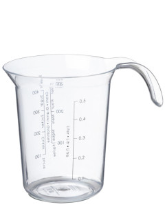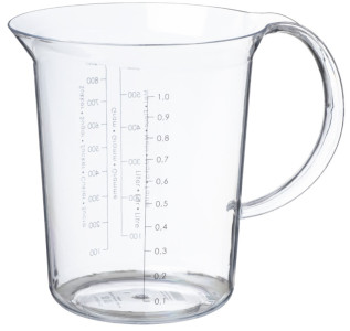 Maße: (B)135 x (T)78 x (H)93 mm, aus Kunststoff, Messbecher, mit einer Liter-, Zucker- und Mehlskala in 5 Sprachen,, einfaches Ausgießen durch Ausgusslippe, platzsparend stapel-, bar, zum Abmessen und Dosieren von Back- und Kochzutaten, (39050800)