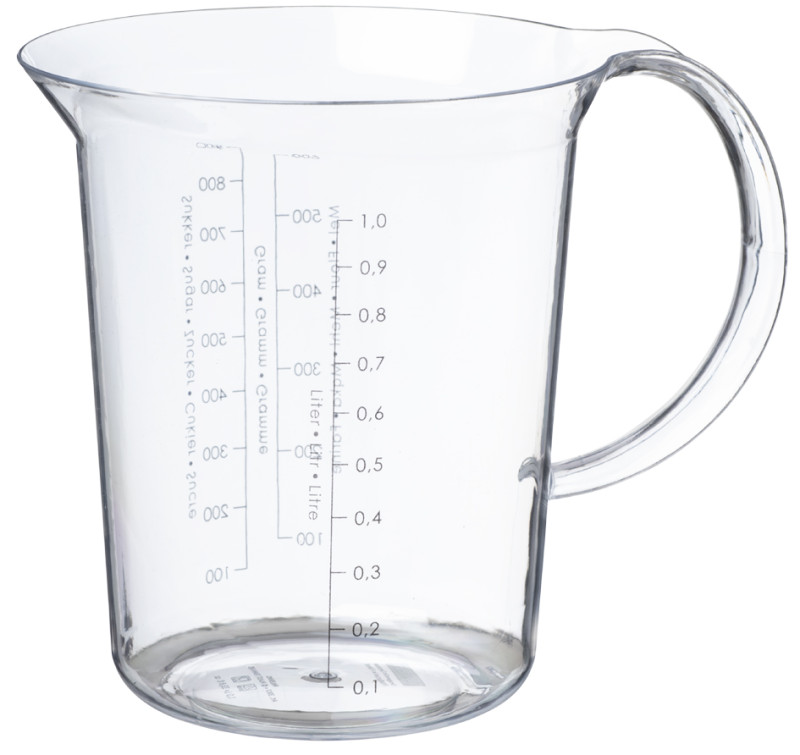 Maße: (B)156 x (T)104 x (H)124 mm, aus Kunststoff, Mess-, becher mit einer Liter-, Zucker- und Mehlskala in 5 Sprachen, einfaches Ausgießen durch Ausgusslippe, platzsparend stapel-, bar, zum Abmessen und Dosieren von Back- und Kochutensilien, (39060800)