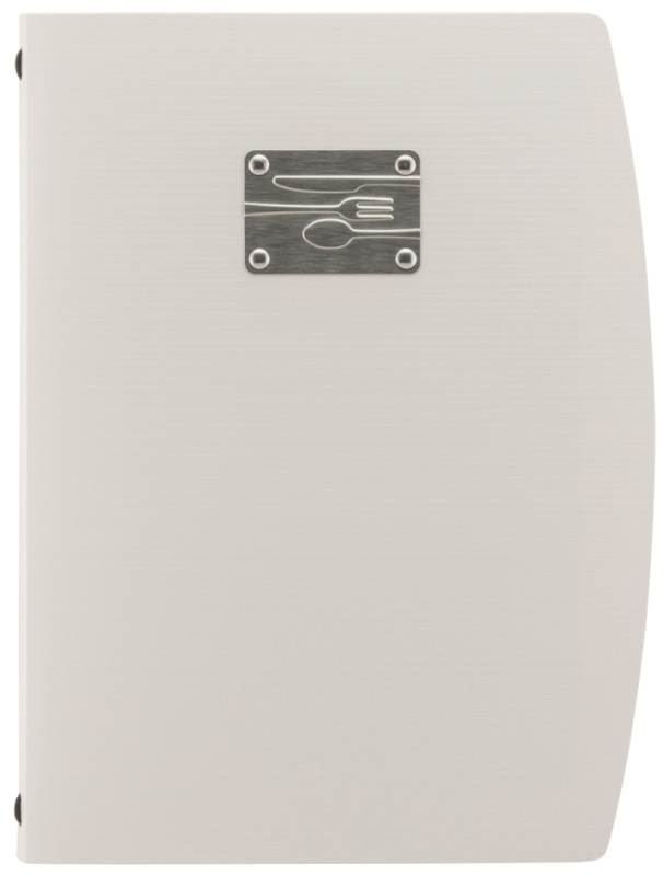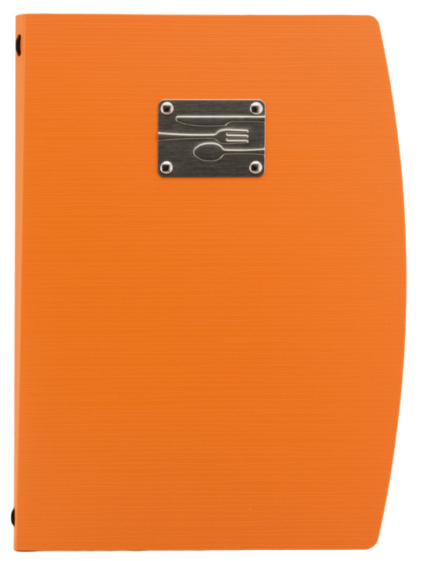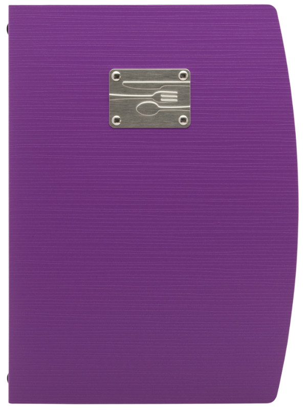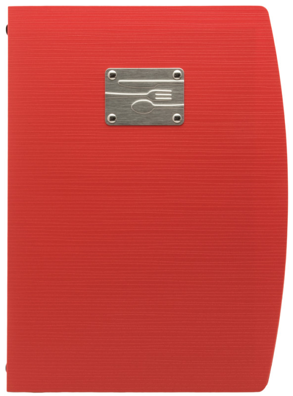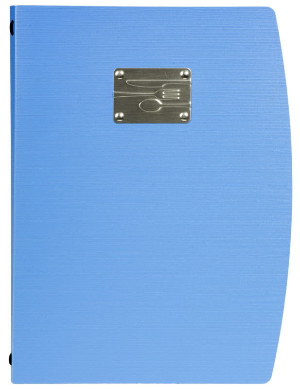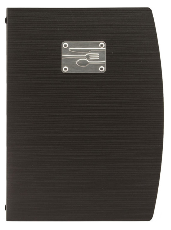 Mappe aus Kunststoff, Vorderseite mit geprägtem Schriftzug, MENU auf Edelstahlplatte veredelt, Mappe biegsam, inkl., 1 doppelseitigen, transparenten Schutzhülle für 4 Seiten,, Maße: (B)250 x (H)340 mm, (MC-RCA4-BL-FK)