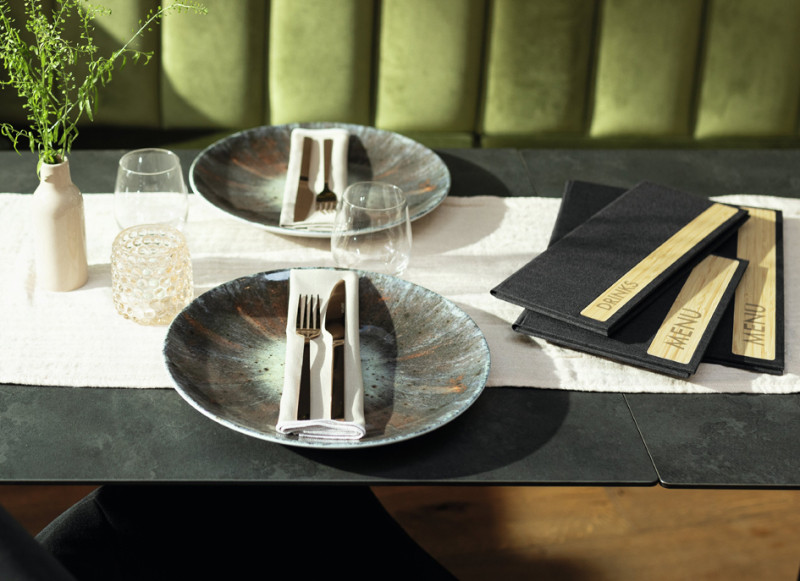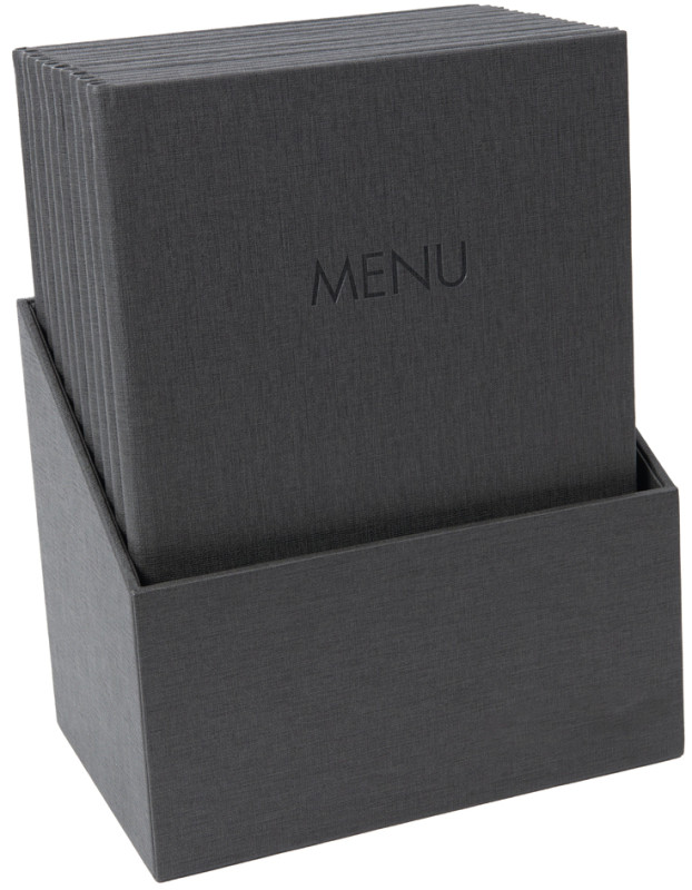 aus RPET (Polypropylen recycelt), mit Gummibindung,, mit Schriftzug MENU auf Bambus, für 8 Seiten, inkl. 2, transparenten PP-Hüllen für DIN A3 Blätter,, Maße: (B)240 x (T)15 x (H)340 mm, (SM220)
