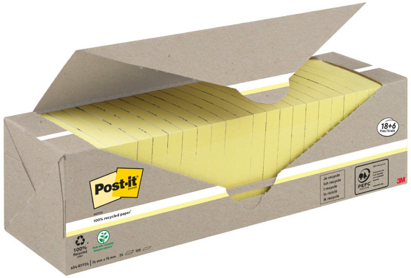 jaune, 100 % papier recyclé, 100 feuilles/bloc,, dans un disctributeur carton, contenu: 24 blocs, (654-RYP24),