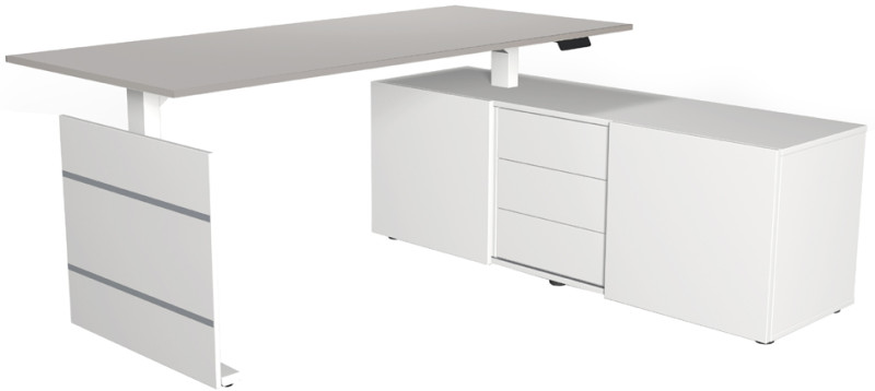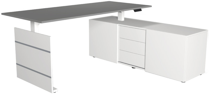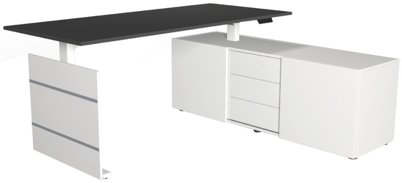 bestehend aus: Sitz-Steh-Schreibtisch (B)1.800 x (T)800 x, (H)740 mm, Sideboard (B)1.600 x (T)500 x (H)570 mm -, mit 2 Schiebetüren & mittig 3 Schubladen, hintere Bereich, des Sideboards kann als PC-Fach genutzt werden, Fuß weiß, (103845.1)