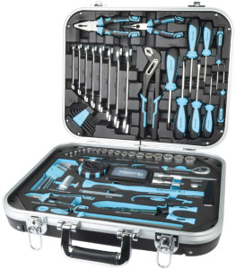 Inhalt: 30x Bits, 8x Gabelschlüssel, 17x Winkelschrauben-, dreher, 1x Wasserpumpenzange, 1x Telefonzange, 1x Kombizange, 6x Werkstatt-Schraubendreher, 2x Feinmechaniker Schrauben-, dreher, 1x Bandmaß, 1x Werkstattfeile, 1x Abbrechmesser,, (Q25100)