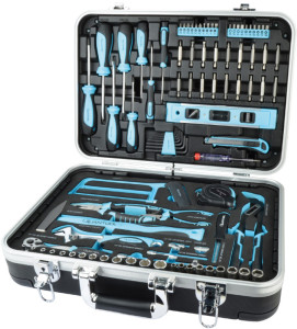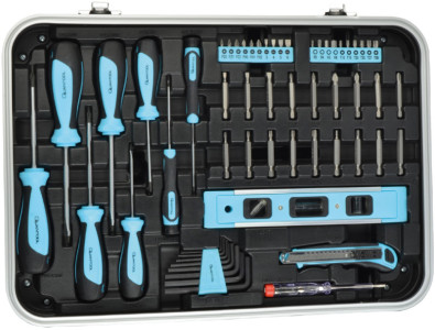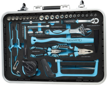 Inhalt: 1x Abbrechmesser, 9x Steckschlüssel, 13x Steck-, schlüsseleinsätze, 2 Verlängerungen, 1x Kardangelenk, 1x, Umschaltknarre, 8x Winkelschraubendreher, 1x T-Gleitgriff,, 1x Bandmaß, 1x Telefonzange, 1x Bit-Adapter,, (Q25102)