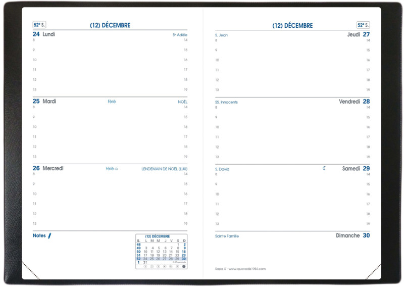 ------------------ Pour le Marché: F -----------------------, 1 semaine/2 pages, papier blanc, reliure cousue, couverture, Impala plastique grainé, période: janvier à décembre,12 mois, (361031Q),