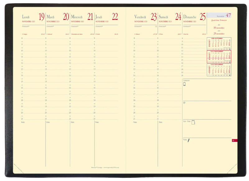 -------------------- Pour le Marché: F ---------------------, 160 x 240 mm, 1 semaine s/2 pages, décembre-décembre,13 mois, couverture Impala plastique grainé noir, reliure cousue,, papier ivoire, impression bicolore, avec répertoire amovible, (286065Q)