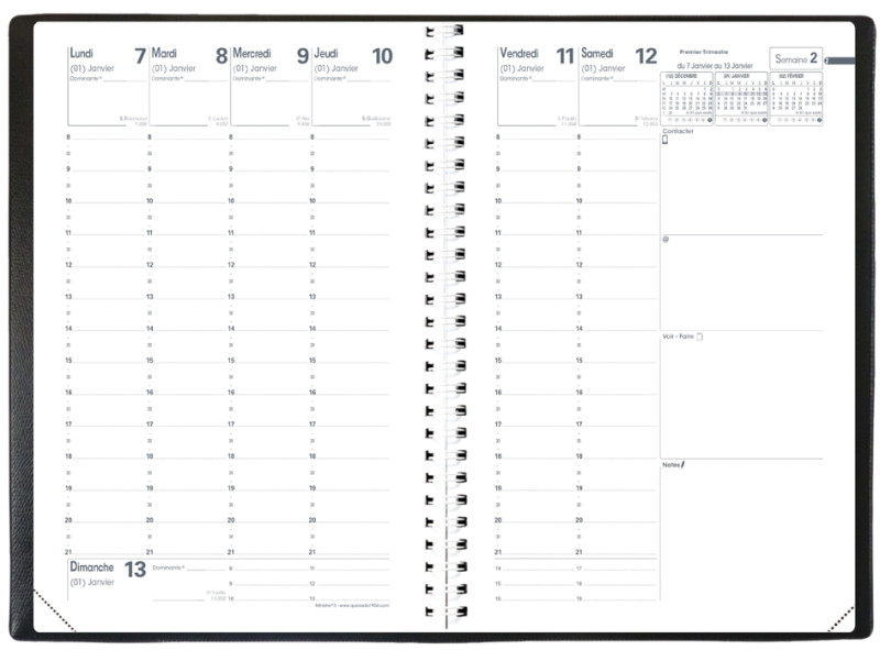 --------------------- Pour le Marché: F --------------------, 1 semaine sur 2 pages, durée: décembre à décembre, 13 mois,, couverture Impala plastique grainé noir, reliure spiralée, métallique Wire'O, papier blanc, impression bicolore, atlas, couleur, avec répertoire amovible (683008Q)