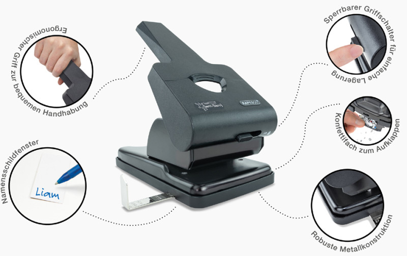 capacité de perforation: 63 feuilles, avec levier prolongé, pour une force de pression supplémentaire, avec protection, antibactérienne, poignée verrouillable, réceptacle à, confettis en caoutchouc,, (1631)