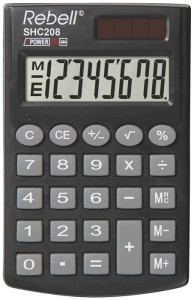 affichage LC à 8 chiffres, fonctionne avec pile/solaire,, opérations arithmétiques de base, inversion de signe, calcul, de pourcentage, fonction mémorisation, housse de protection, dimensions : (L)62 x (P)100 x (H)8 mm, poids : 37 g, (RE-SHC208)