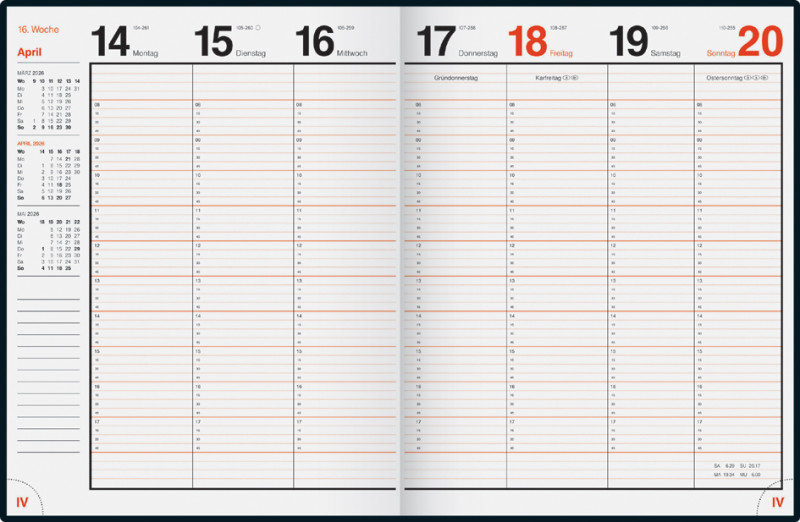 ------------------- für den Markt: D -----------------------, Blattgröße: 183 x 240 mm, Kalendarium: 1 Woche auf 2 Seiten, Gesamtumfang: 144 Seiten, Druck: schw/rot, Einband: Schaum-, folie Catana, Klebebindung, Eckperforation, mit Zeichenband, (7027042586)
