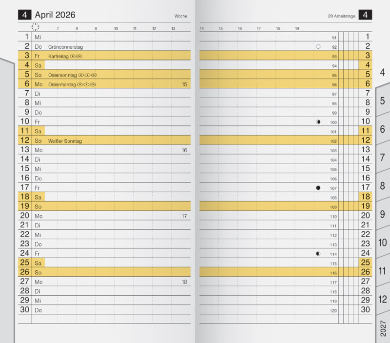 ------------------- für den Markt: D -----------------------, Blattgröße: 87 x 153 mm, Kalendarium: 1 Monat auf 2 Seiten,, Gesamtumfang: 32 Seiten, Druck: grau/gelb, Karton-Umschlag,, mit Monats-Registerschnitt, (7046820006)