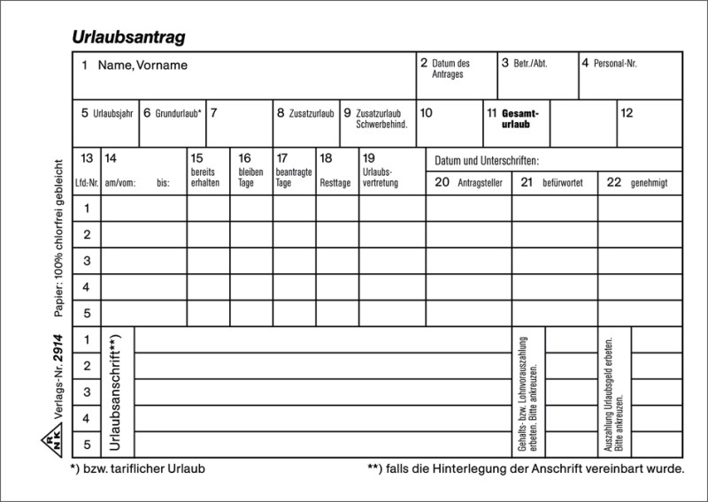 ------------------ Für den Markt: D ------------------------, Block, DIN A6 quer, 50 Blatt, Vorderseite: Antrag auf Er-, holungs- oder Zusatzurlaub, Rückseite: Antrag auf Frei-, stellung für Sonderurlaub, (2914)