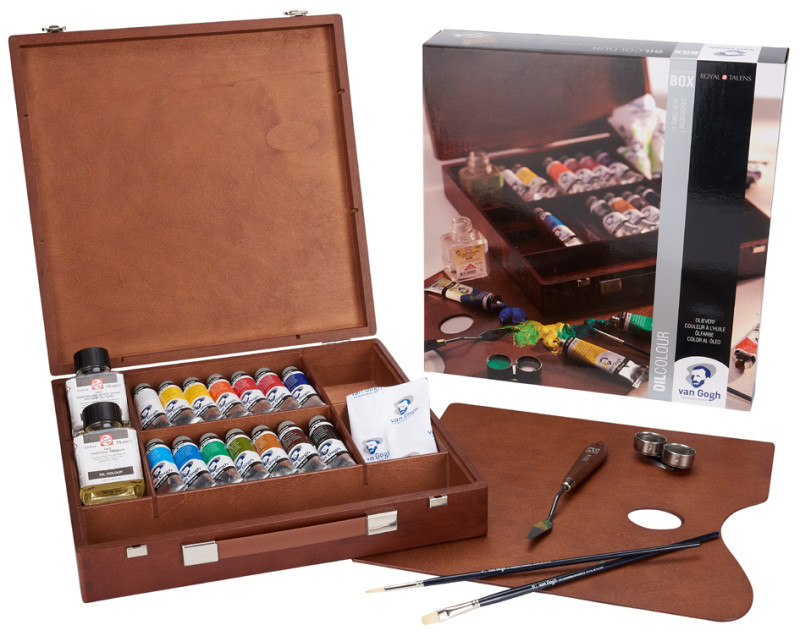 Lieferung im hochwertigen Holzkasten, Inhalt: 14 x 40 ml, Tuben, 75 ml Terpentinersatz, 75 ml Malmittel, je 1x, Pinsel flach (Größe 10), Pinsel rund (Größe 6), Malmesser,, Doppelpalettenbecher, Holzpalette, Reinigungstuch, Broschüre, (02840100)