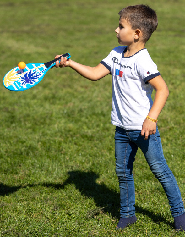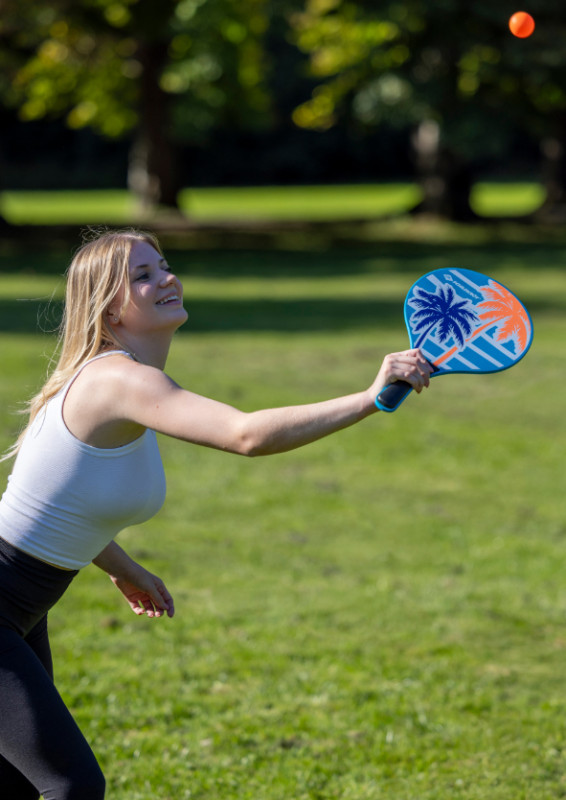 2 raquettes de beachball en bois laqué (longueur: 378 mm /, largeur: 235 mm / épaisseur: 8 mm), 2 balles, dans un filet, avec cordon de serrage, (970157),