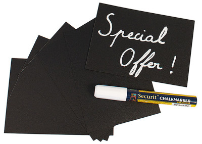 à double face inscriptible avec feutres-craies, à nettoyer, avec un chiffon humide, kit composé de: 20 x ardoises en A8, 1 x feutre-craie en noir, 4 x supports Spike, 2 x supports, acryliques, utilisable égalament comme présentoir de table, (TAG-A8-BL)