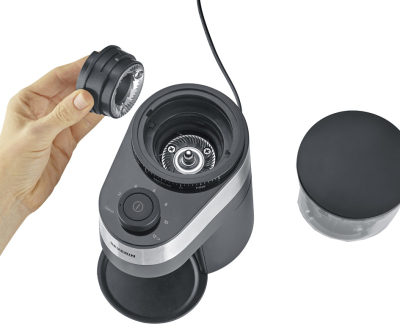 Mahlgrad in 30 Stufen einstellbar, von sehr fein bis grob,, einstellbare Mengendosierung von 2-12 Tassen, herausnehm-, barer Bohenbehälter, Fassungsvermögen von bis zu 240 g,, herausnehmbarer Pulverbehälter (130 g) mit Aromadichtung, (KM 3880)