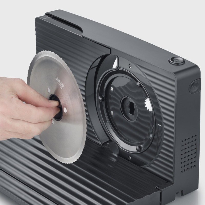 moteur DC, lame circulaire amovible en acier inoxydable,, réglage de l'épaisseur de coupe de 0 à 15 mm, plateau, repliable avec logement pour le cordon, (AS 9578),