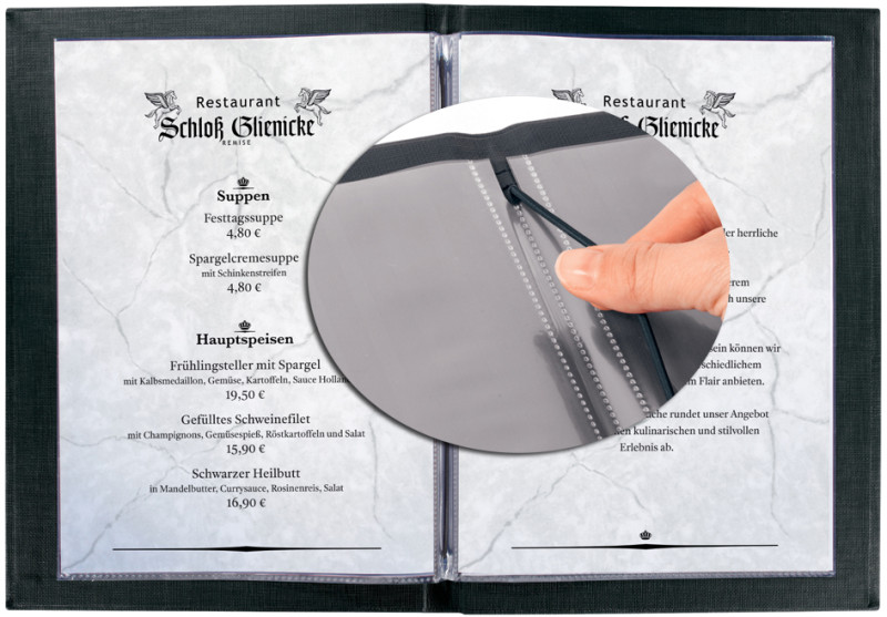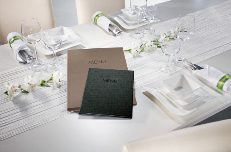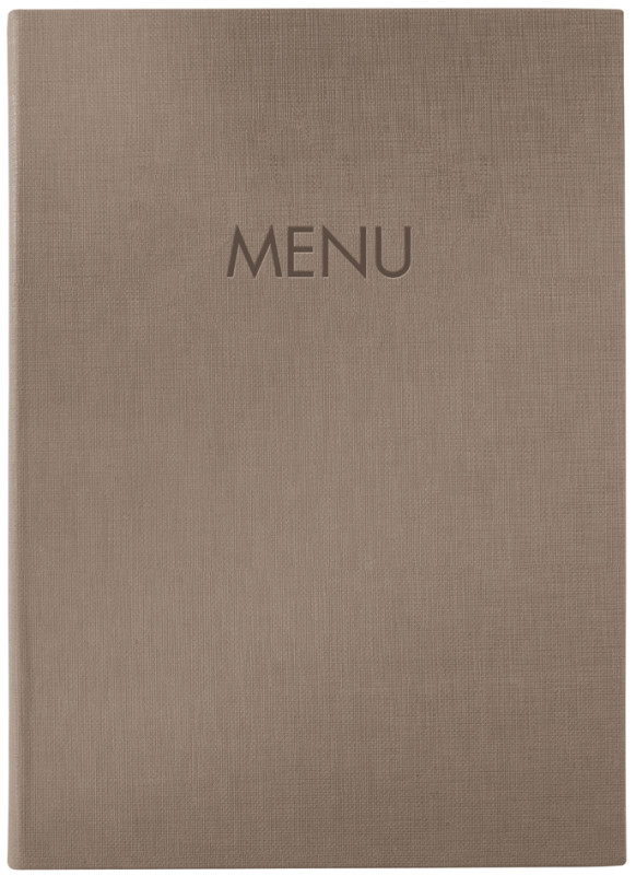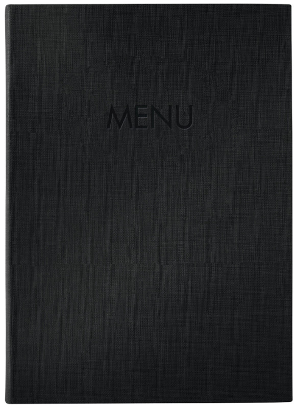 couverture en plastique avec structure en lin, face avant, avec insciption MENU en gaufrage à froid, incl. 2x double, pochette transparente pour 8 pages, extensible, (SM211),
