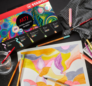 boîte en carton noire de grande valeur ARTY, kit cadeau,, assorti en couleurs, boîte avec bandeau coloré imprimé,, contenu: 5x pastel BOSS ORIGINAL, 9x woody, 12x aquacolor,, 12x pen 68, 12x point 88, (77/6-2-20)