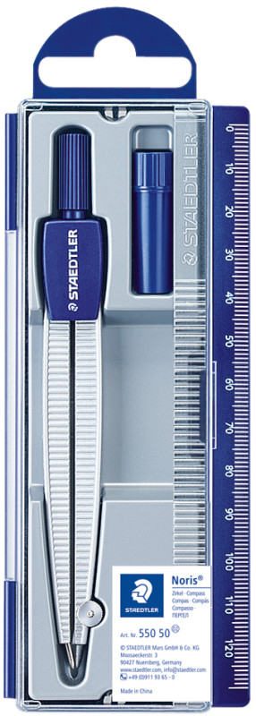 Compas de précision dans un étui à clapet, avec aiguille, obstusangle,sans risque de blessure, branche rigide, diamètr, de cercle maximal environ 300 mm, avec garniture de plomb,, adaptateur universel pour crayons jusqu'à 11 mm de diamètre, & boîte à mine (550 60)