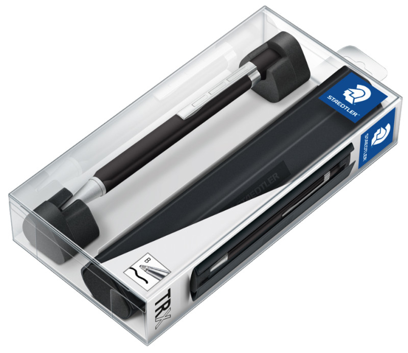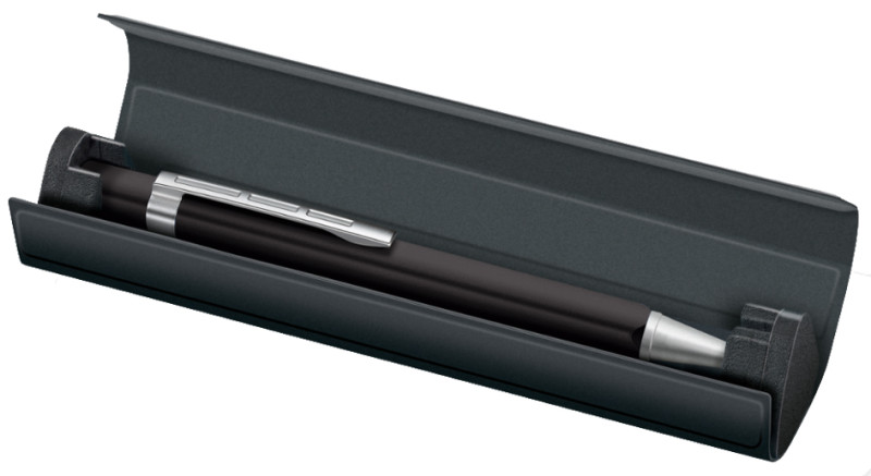 Shank en aluminium anodisé, de forme triangulaire, avec clip, capuchon en métal argenté, incl. Recharge en noir, incl. Étui noir, en präsentativer emballage transparent (440TRX9B-9),