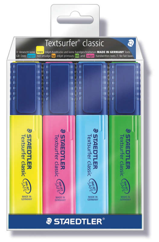 largeur de tracé: 1,0 - 5,0 mm, pointe biseautée, résistant, à la lumière, INKJET SAFE, pour papier, fax et autocopiants,, lavable, couleurs assorties: jaune, rose, vert, bleu, contenu: 4 pièces, (364 WP4)