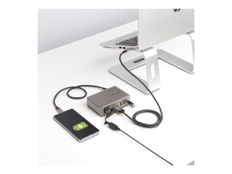 Ajoutez dix ports USB 3.2 Gen 2 (10Gbps) (8x USB-A, 2x USB-C) à un ordinateur USB-C à l'aide de ce Hub USB-C à 10 ports. Le hub USB est auto-alimenté par l'adaptateur secteur fourni. Le hub USB dispose d'une protection contre les surintensités (OCP). L'OCP permet d'éviter que les périphériques ne consomment trop d'énergie, que les dispositifs USB ne tombent en panne et que les ordinateurs ne s'éteignent de manière inattendue. La prise en charge de Wake On USB permet aux communications USB, provenant de périphériques connectés au hub, de sortir l'ordinateur de la veille ou d'autres modes d'économie d'énergie/de sommeil.