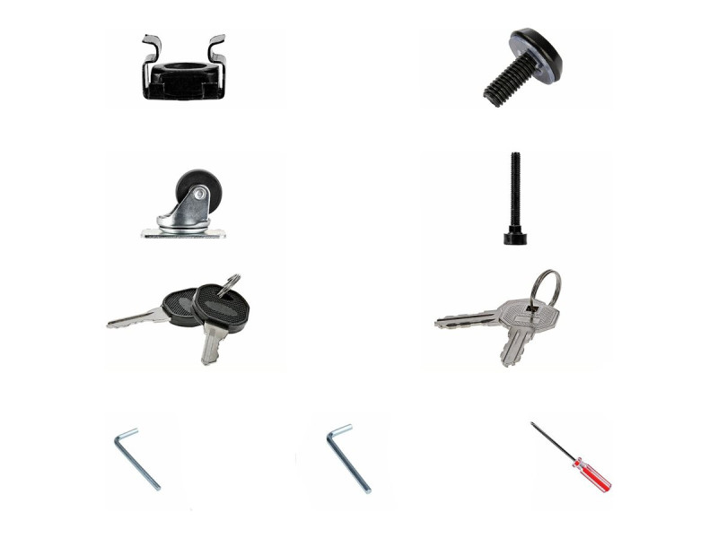Tournevis Phillips, 2 roulettes, panneau supérieur, panneau avant, porte arrière, 2 clés de panneau latéral, 2 clés de porte, 4 pieds de nivellement, 24 écrous à cage M6, 2 x roulettes avec dispositif de blocage, 2 panneaux latéraux et châssis, 4 poutres supérieures et inférieures, 2 panneaux inférieurs avec logement de gestion de câble, panneau inférieur (massif), 8 couronnements d'angle en plastique, 8 vis hexagonales M8-20, 8 rondelles à ressort M8, 8 vis à tête plate M4-10, 4 vis hexagonales M6-12, 6 vis M5-12, clé hexagonale M6, clé hexagonale M8, 24 vis Phillips M6-12, 24 rondelles à collerette M6 en plastique, 16 boulons Phillips M6-10, 2 broches de charnières de porte