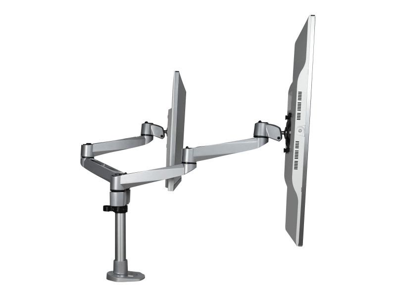 Créez un espace de travail ergonomique avec ce bras pour deux écrans de bureau de qualité, pouvant accueillir des écrans d''une taille maximale de 27" chacun. Les deux bras articulés à double pivot offrent aux écrans une grande liberté de mouvement latéral. Sa finition argentée élégante ajoute une touche esthétique à votre espace de travail.