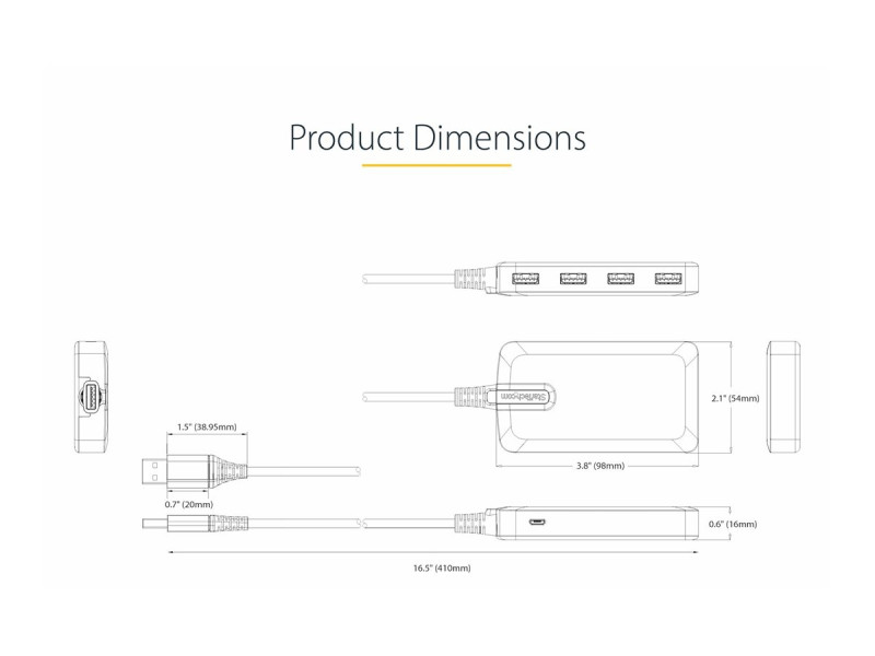 Le hub USB peut fonctionner avec l'alimentation bus seule, mais il dispose d'une entrée d'alimentation Micro USB qui peut être connectée à un adaptateur d'alimentation USB (non inclus), fournissant jusqu'à 4,5W (5V/0,9A) d'alimentation en plus des 4,5W d'alimentation bus de l'hôte USB. Cette flexibilité est idéale pour les applications où une alimentation supplémentaire peut être nécessaire, par exemple pour connecter un périphérique USB à haute puissance, comme un SSD externe, tout en utilisant les autres ports pour connecter des périphériques moins puissants. Les ports en aval sont chacun capables de fournir jusqu'à 4,5 W d'alimentation aux périphériques connectés. Pour une protection supplémentaire de ce hub USB et du périphérique hôte connecté, le hub USB dispose d'une protection contre les surintensités (OCP). L'OCP empêche les périphériques USB défectueux de consommer plus d'énergie que celle allouée en toute sécurité.
