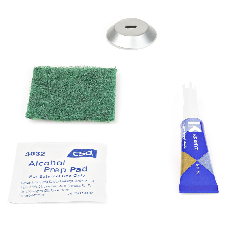 Colle, tampons adhésifs, tampon abrasif, chiffon imbibé d'alcool