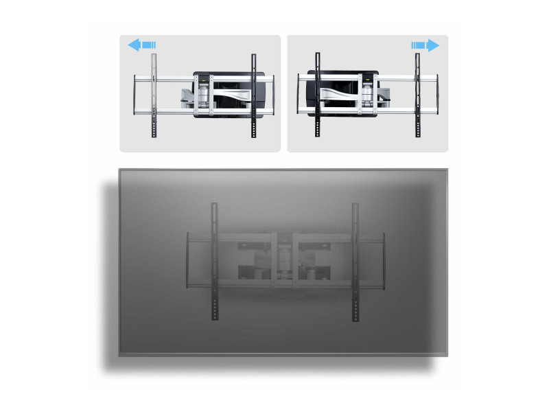 Créez une solution de montage TV avec ce support mural articulé compatible avec les téléviseurs jusqu'à 100 pouces et d'un poids maximal de 85 kg. Idéal pour les salles de conférence, les espaces clients et les environnements collaboratifs où la durabilité, la précision et la présentation sont essentielles. Support mural articulé robuste Le support se replie à seulement 10,5 cm du mur et s'étend jusqu'à 55 cm pour un accès facile à l'arrière du téléviseur. Le montage à double montant (espacement de 16 po) et le design à double bras assurent une installation sécurisée et un mouvement fluide lors du positionnement de l'écran. Pour un ajustement parfait, vous pouvez incliner l'écran (+2°/-12°) et le faire pivoter (+/-60°) après installation afin d'obtenir le meilleur angle de vision. Le support pour écran plat est conforme à la norme TAA pour répondre aux exigences d'approvisionnement. Montage polyvalent avec finition haut de gamme Ce support mural compatible VESA prend en charge des configurations jusqu'à 800x500 mm et comprend la visserie, les entretoises et un gabarit mural pour une installation propre et rapide. Il peut être fixé sur des montants en bois, des murs en brique ou en béton, offrant une grande flexibilité d'installation. Des canaux intégrés permettent de garder les câbles bien organisés, tandis que la structure en acier et aluminium argenté, avec des caches décoratifs, crée un aspect raffiné et professionnel sous tous les angles.