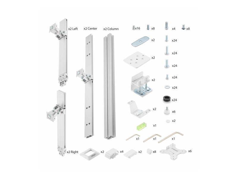 2 x desk clamps, 2 x grommet base plate, 2 x grommet clamp plate, 2 x columns, 6 x crossbars, 4 x crossbar munting brackets, 6 x VESA bracket, 6 x VESA bracket screws, 8 x cable-management clips (crossbar), 4 x clips de gestion des câbles, 2 x endcaps, 2 x base caps, 10 x clamp pads, 8 x base screws, 16 x crossbar screws, 8 x button head screws, 4 x socket head screws, niveau, 24 x M4x12 screw, clé hexagonale (4 mm), clé hexagonale (5 mm), clé hexagonale (6 mm), 24 x M4x16 screws, 24 x M5x12 screws, 24 x M5x16 screws, 24 x spacers, 24 x washers