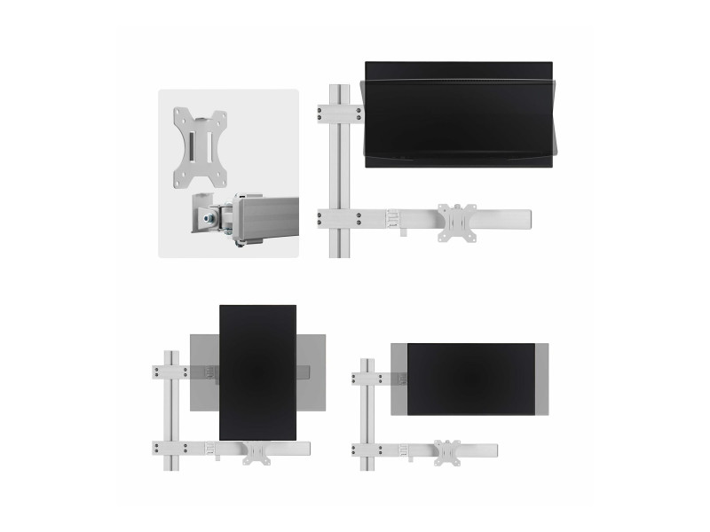 Le support ergonomique VESA offre une rotation de +/-17°; une inclinaison de +/-34°; et une rotation de 360° pour une orientation en mode portrait ou paysage, avec des motifs 75x75/100. Chaque support d'écran peut supporter jusqu'à 8 kg.