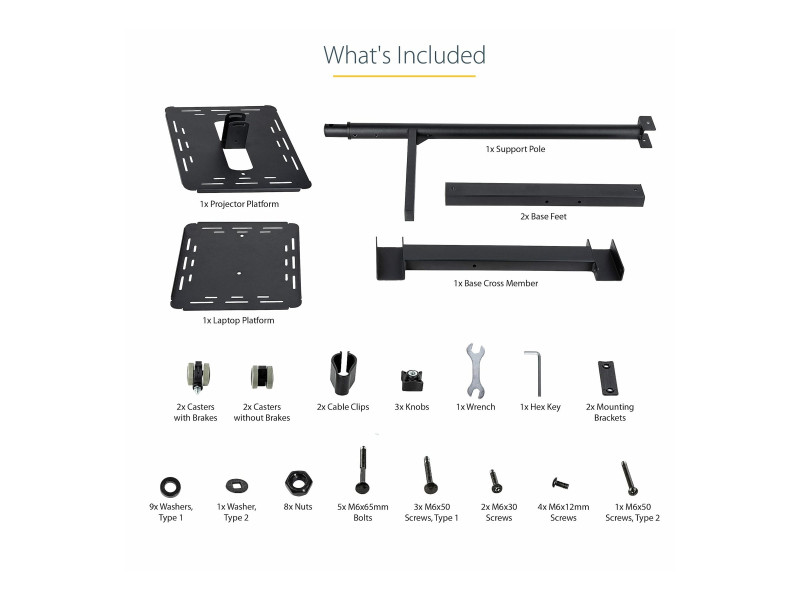 Clé hexagonale, clé, 8 x écrous, 4 x vis M6 x 12 mm, 2 attaches de câble, plate-forme de projecteur, plate-forme pour ordinateur portable, poteau de support, traverse de base, 2 x pieds de base, 5 x boulons M6 x 65 mm, 9 x rondelles (Type 1), 2 x vis M6x30, 3 x vis M6 X 50 (type 1), rondelle (type 2), vis M6 X 50 (type 2), 2 x roulettes avec freins, 2 x roulettes sans frein, 3 x boutons, 2 x supports de montage