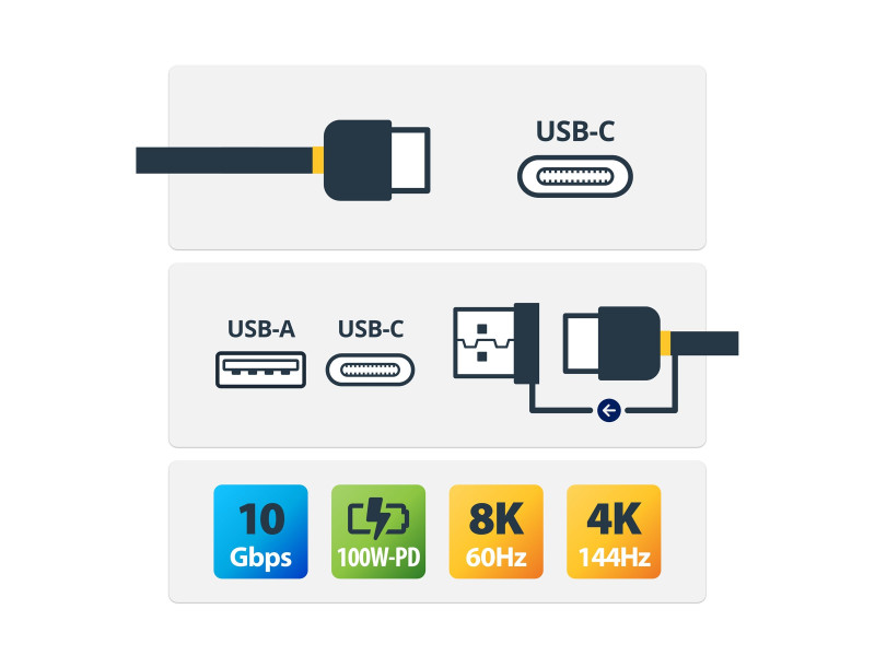 Alimentation USB (100 W), débit de données de 10 Gbps, débit de données de 5 Gbps
