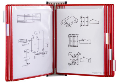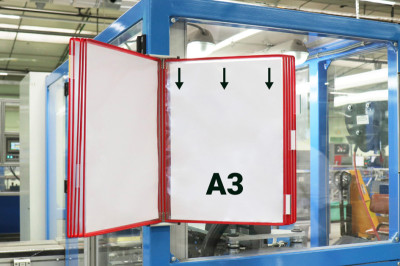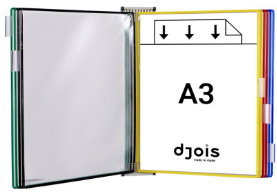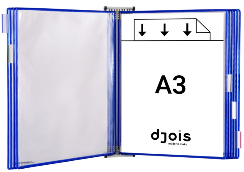 support en tôle d'acier, laqué gris lumière, livraison incl., 10 poches à pivot A3, bleu, 5 cavaliers, 4 butées latérales, et matériel de fixation, (413101),
