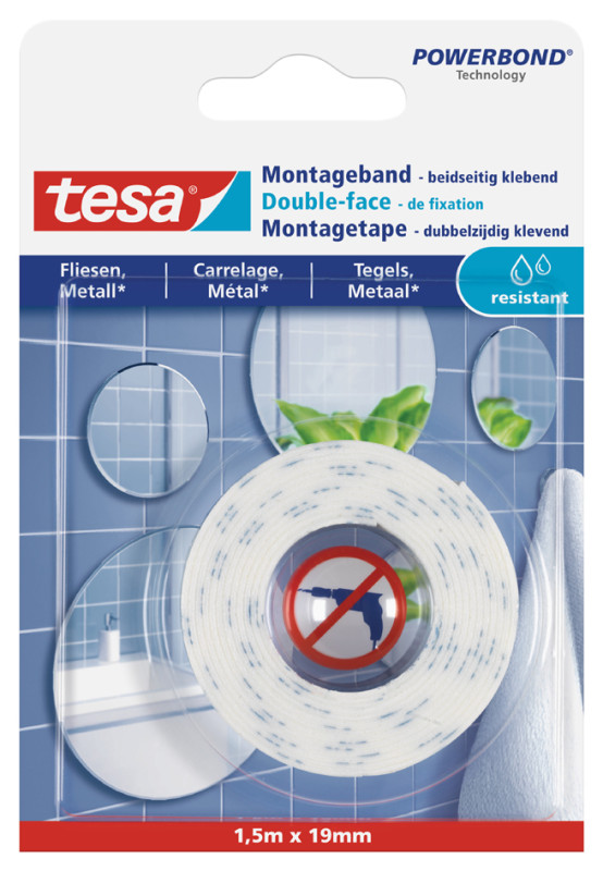 19 mm x 1,5 m, ruban adhésif double-face, très fort, adhère, en permanence sur carrelage, acier, métal, placage, verre,, soutient les miroirs et objets plats épais jusqu'à 4 mm, (77744-00000-00 ),