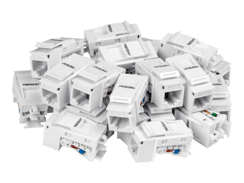 Prises Keystone blindée Cat6 de TRENDnet comprend vingt-cinq prises keystone Cat6 pour une utilisation avec les panneaux de raccordement keystone vierge TC-KP24 de TRENDnet. Chaque prise keystone fournit un débit de 10Gb/s sur un câble Ethernet CAT.6 de 55m (180 pieds.). Ces prises keystone CAT.6 sont d'une conception pratique et ne nécessitent pas d'outil. Elles disposent d'une séparation des fils pour faciliter la terminaison des câbles.