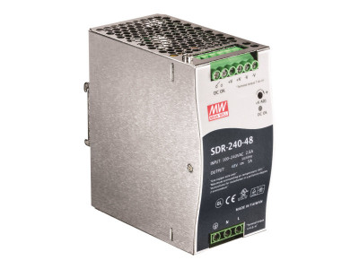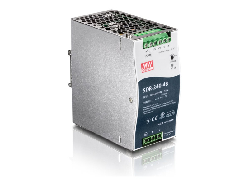 L'alimentation électrique rail DIN industrielle à sortie simple de 240 W à haute efficacité de TRENDnet, le modèle TI-S24048 (Mean Well SDR-240-48), fournit une alimentation jusqu'à 240 watts (48 V, 5 A) au matériel PoE industriel tels les switches, les caméras réseau et les points d'accès Wi-Fi. Cette alimentation électrique est fournie avec une Compensation de Puissance Réactive (PFC), une fixation rail DIN et une protection contre les surcharges de courant.