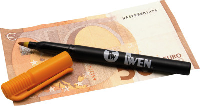 détection directe de l'authenticité, pour billets de toutes, les devises, faux: le trait sur le billet change de couleur,, vrai: le trait s'estompe & devient légèrement jaunâtre,, sur carte blister, (111-0353)