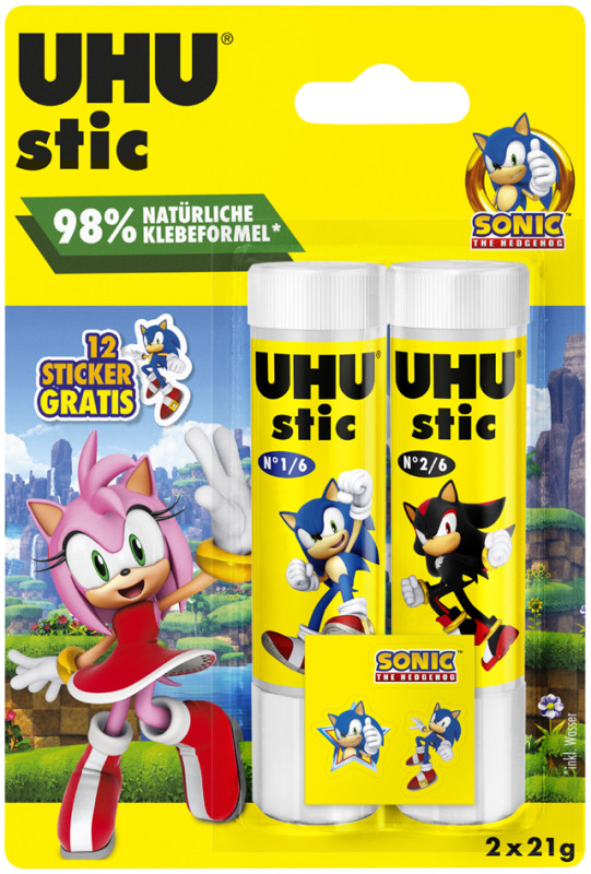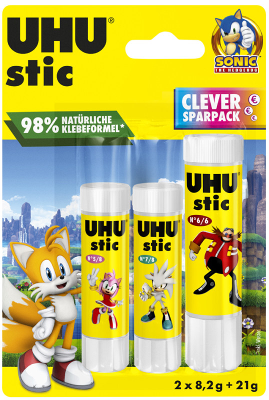 bâton de colle aux motifs SONIC, sans solvant, capuchon à, vis, facilement lavable, 98% de composants d'origine, naturelle, récipient en plastique recyclé à 50%, contenu: 3 bâtons de colle (21 g + 2 x 8,2 g), (9000331/7006048)
