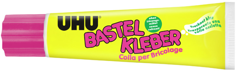 transparente après séchage,colle tous les matériaux courants, comme papier, carton, textile, fleurs sèches et de soie,, feutre, raphia, liège etc. entre eux et avec de nombreux, plastiques, (47735)