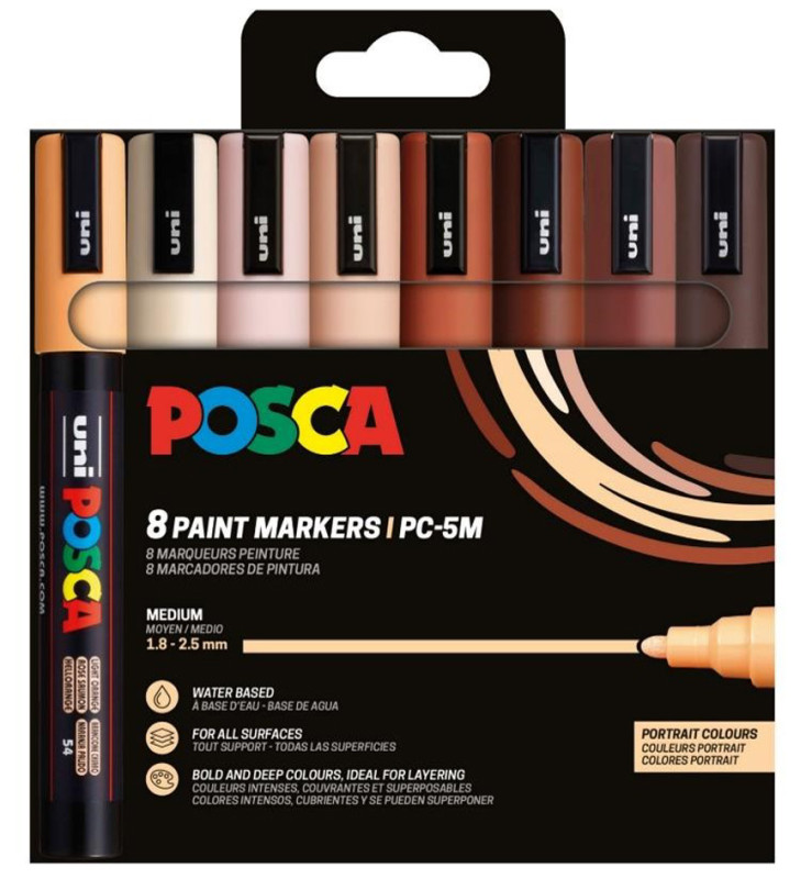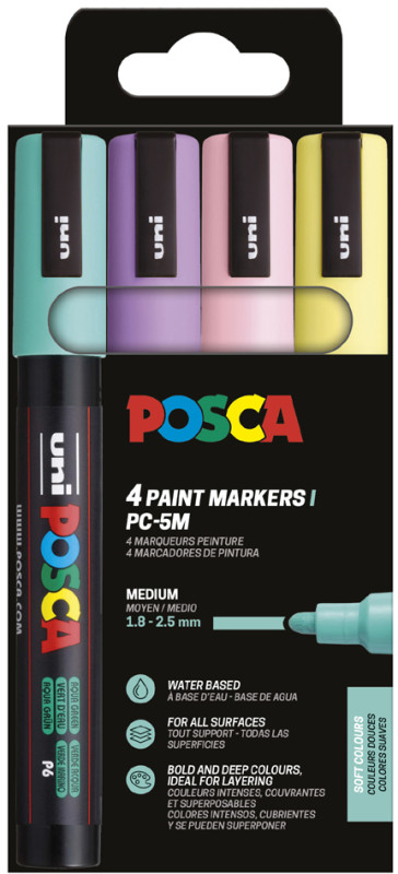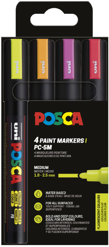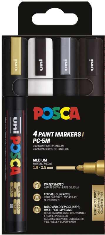 POSCA Marqueur à pigment PC-5M, étui de 4 noir, blanc, or, argent, indélébile, résiste à la lumière, inodore, pointe ogive, largeur du tracé: 1,8 à 2,5 mm, en étui plastique pegbordable contenu: 4 pièces (PC-5M/4A ASS09) assorti dans les couleurs: noir, blanc, or, argent